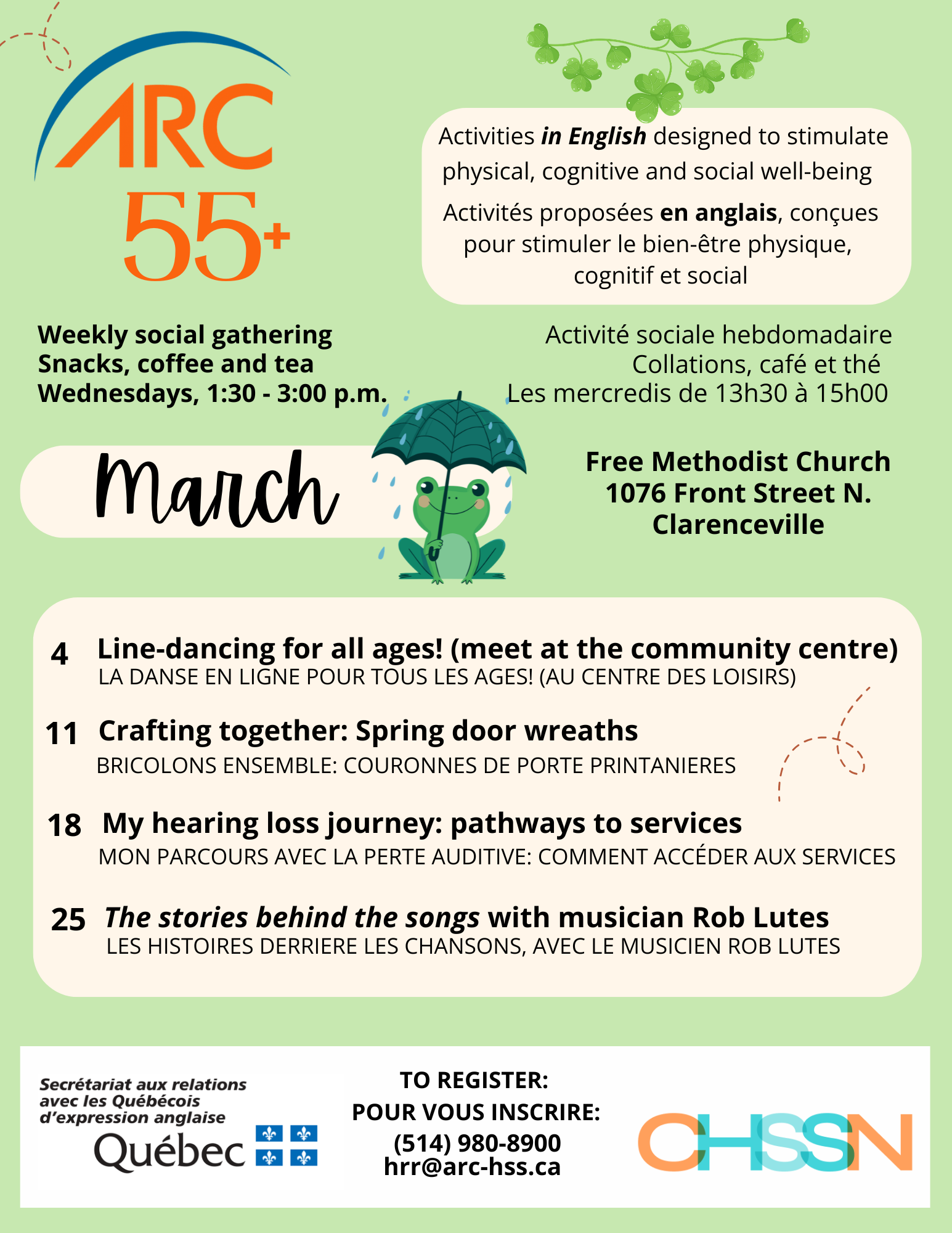 Pour plus d'informations ou pour vous inscrire, contactez Céline par 📧 hrr@arc-hss.ca ou 📞 (514) 980-8900.