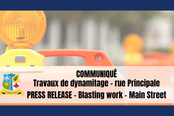 Les travaux de dynamitage débuteront le 6 octobre prochain. Lors des sautages, la circulation sera arrêtée complètement dans les deux sens sur la rue Principale pendant environ 10 minutes pour l'installation et l'enlèvement de matelas de protection et le dynamitage. Il est probable que ces délais occasionnent des attentes et retardent la circulation.